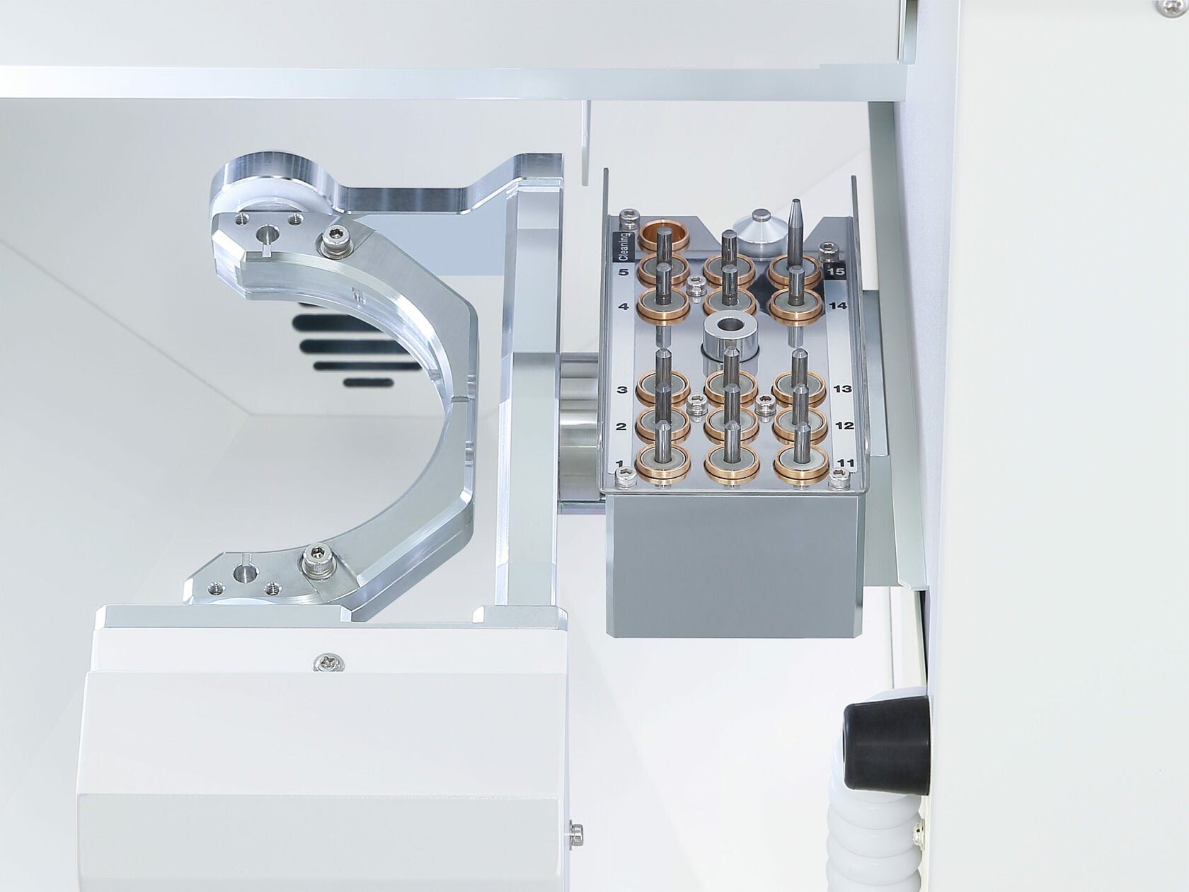 Проектирана за максимална лекота на използване и производителност, DWX-52Di Plus е несравнима за фрезоване на цирконий, восък, PMMA, композитна смола, PEEK, синтеровани метали и други. Машината е оборудвана с иновативен фиксиран C-образен адаптер, който увеличава максимално производителността и рентабилността, позволявайки на потребителите да фрезоват до 10% повече единици от стандартен диск с прецизност и лекота. Освен това, използването на C-образната скоба позволява обработка под ъгъл от 90 градуса, което значително подобрява резултатите от фрезоването и намалява необходимостта от ръчно довършване на реставрациите.